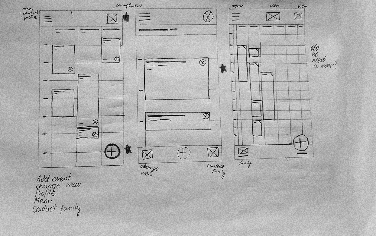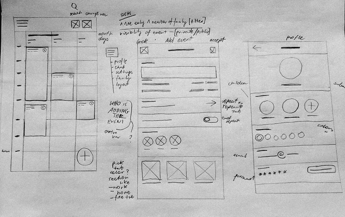 I began with paper sketches and low-fidelity wireframes to explore flows such as creating accounts, adding events, and navigating a shared calendar.